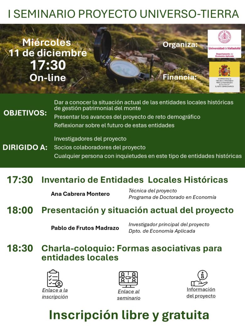 Con fecha 11 de diciembre de 2024 se celebró un primer Seminario online del proyecto Universo Tierra, de acceso libre a todos los interesados, pero dirigido fundamentalmente a los investigadores del proyecto o colaboradores en el mismo.